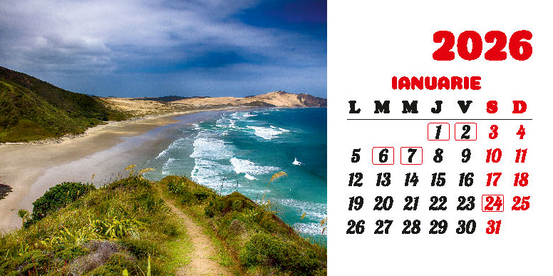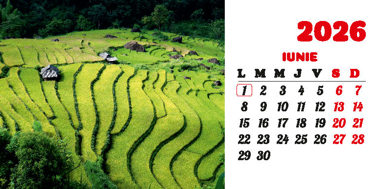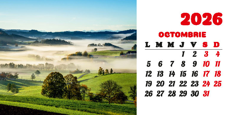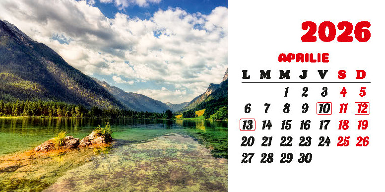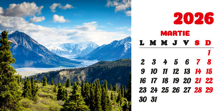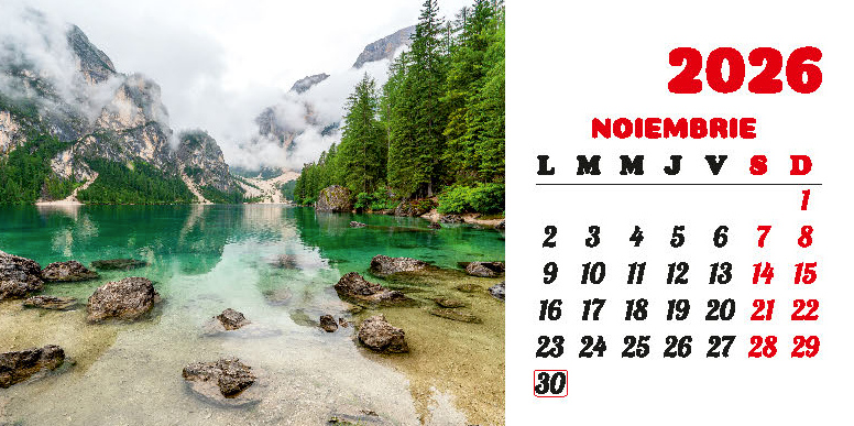 Calendarul de birou “Peisaje” din colecția Darcom, pentru anul 2026, cu spiră metalică, conține 12 file + copertă confecționate din carton dublu cretat mat 150 g/mp, format 21 x 10.5 cm, cu imagini ilustrând diferite peisaje. Imprimarea este realizată în policromie.