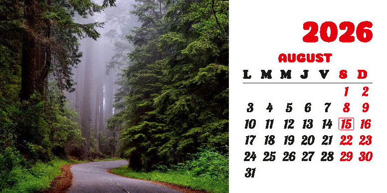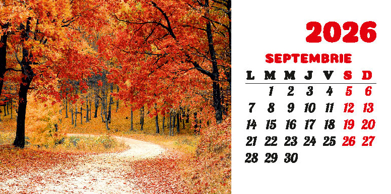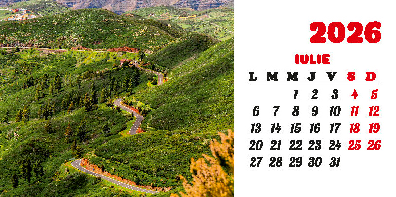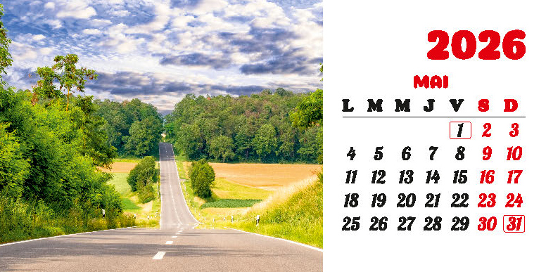 Calendarul de birou “Drumuri” din colecția Darcom, pentru anul 2026, cu spiră metalică, conține 12 file + copertă confecționate din carton dublu cretat mat 150 g/mp, format 21 x 10.5 cm, cu imagini ilustrând diferite drumuri. Imprimarea este realizată în policromie.