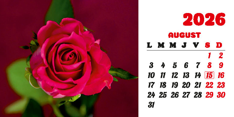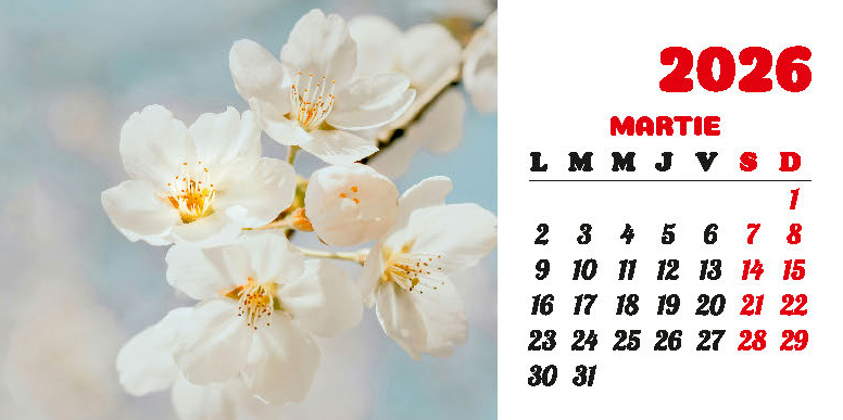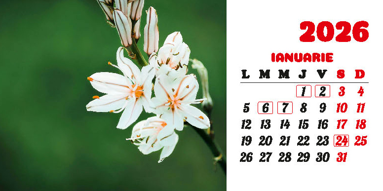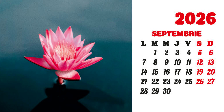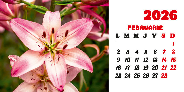 Calendarul de birou “Flori” din colecția Darcom, pentru anul 2026, cu spiră metalică, conține 12 file + copertă confecționate din carton dublu cretat mat 150 g/mp, format 21 x 10.5 cm, cu imagini ilustrând diferite flori. Imprimarea este realizată în policromie.