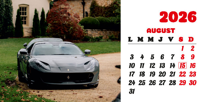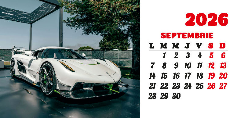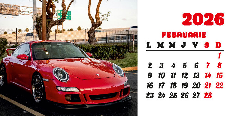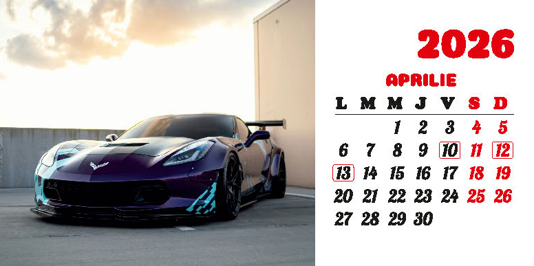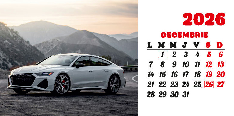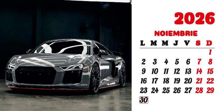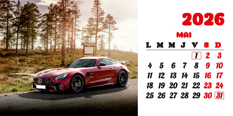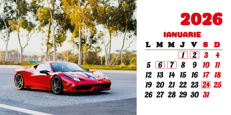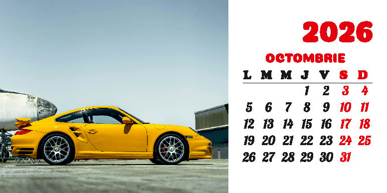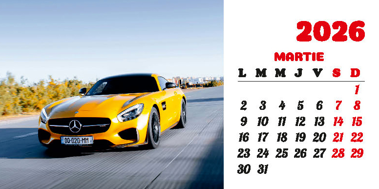 Calendarul de birou “Mașini” din colecția Darcom, pentru anul 2026, cu spiră metalică, conține 12 file + copertă confecționate din carton dublu cretat mat 150 g/mp, format 21 x 10.5 cm, cu imagini ilustrând diferite mașini. Imprimarea este realizată în policromie.