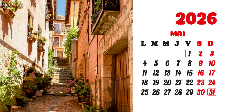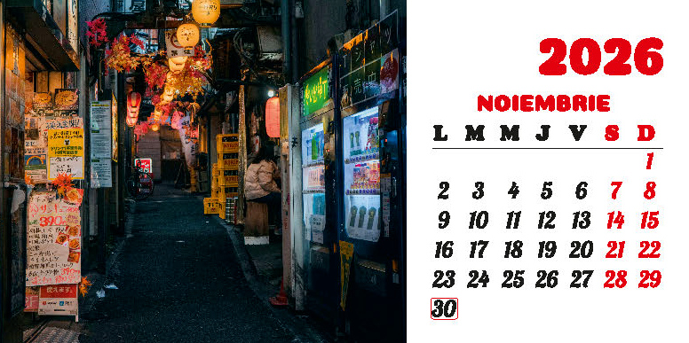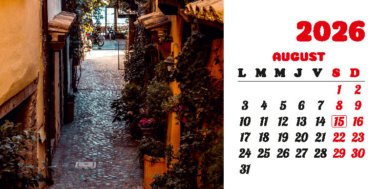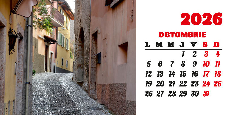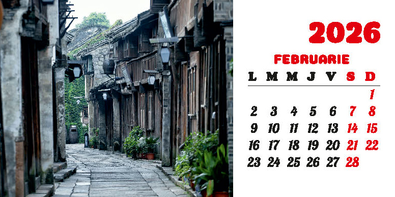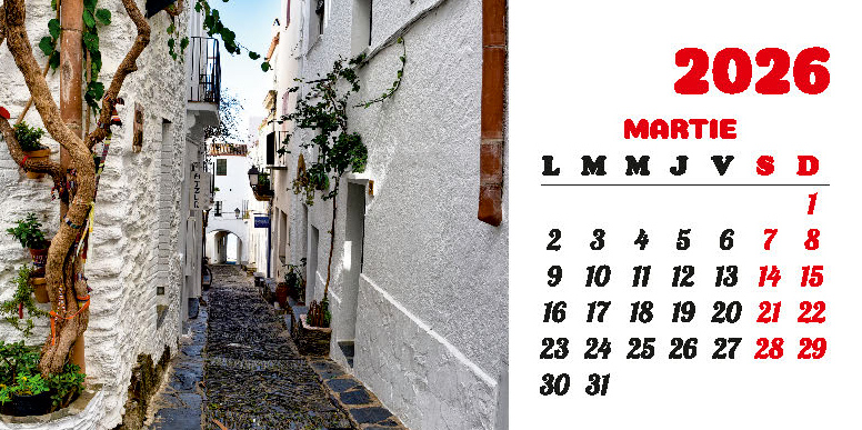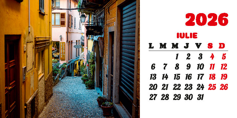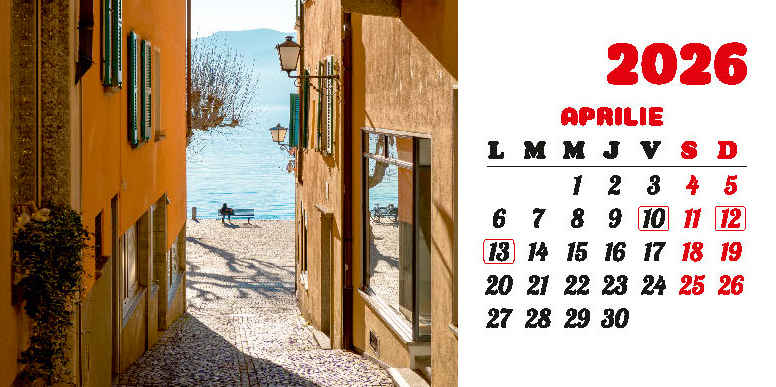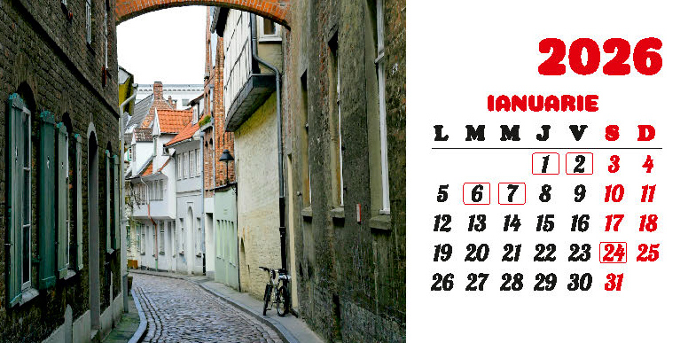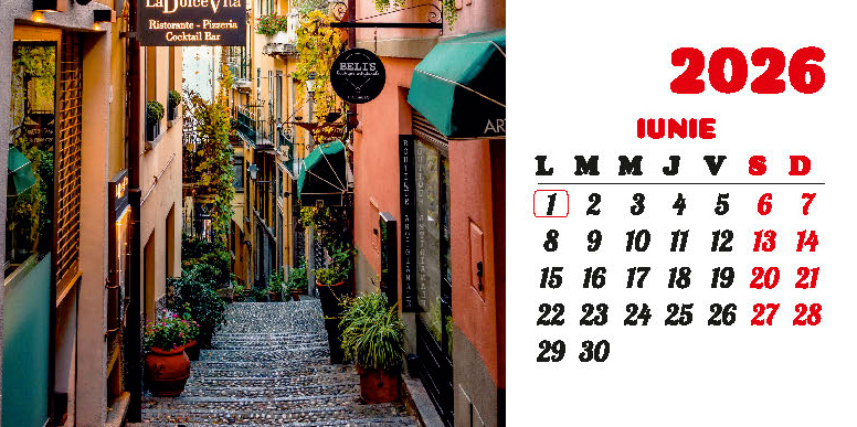 Calendarul de birou “Străzi” din colecția Darcom, pentru anul 2026, cu spiră metalică, conține 12 file + copertă confecționate din carton dublu cretat mat 150 g/mp, format 21 x 10.5 cm, cu imagini ilustrând diferite străzi. Imprimarea este realizată în policromie.