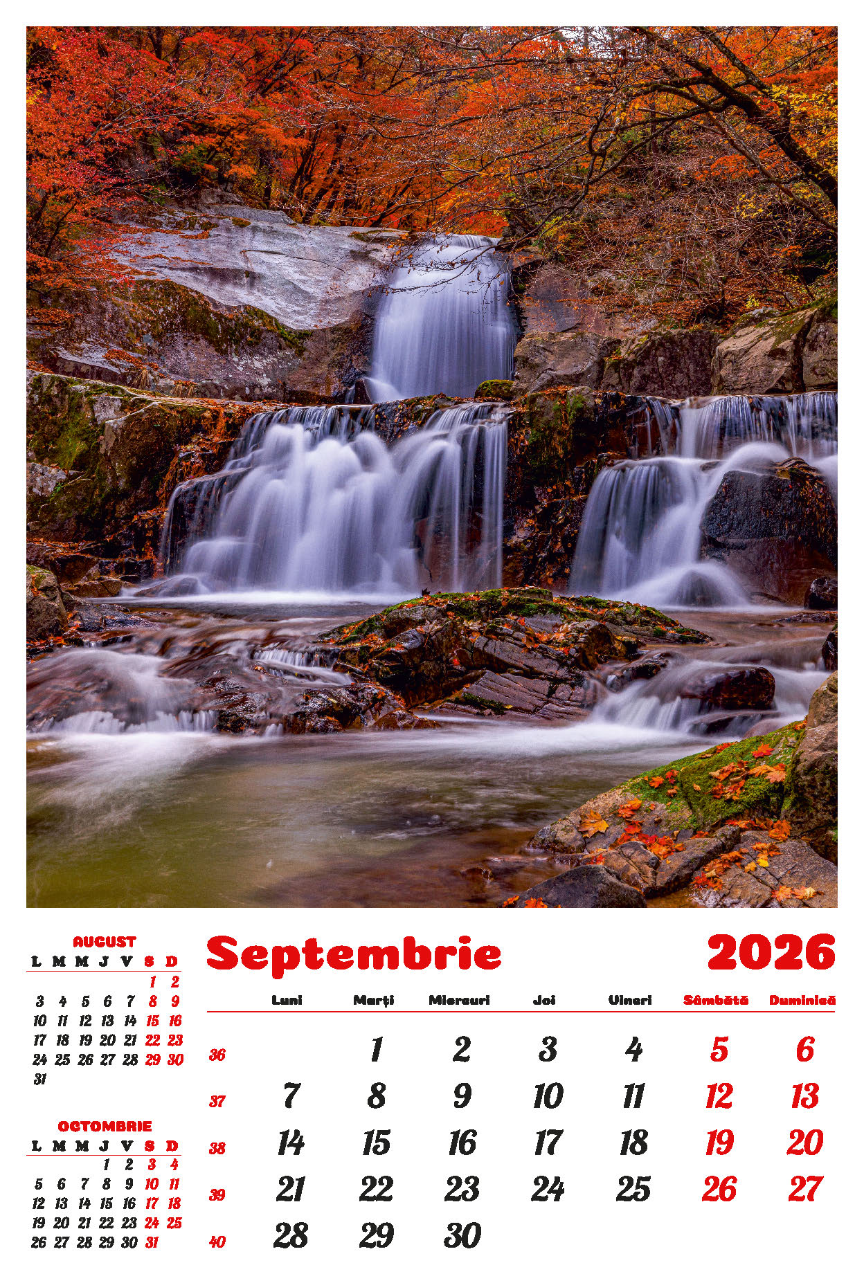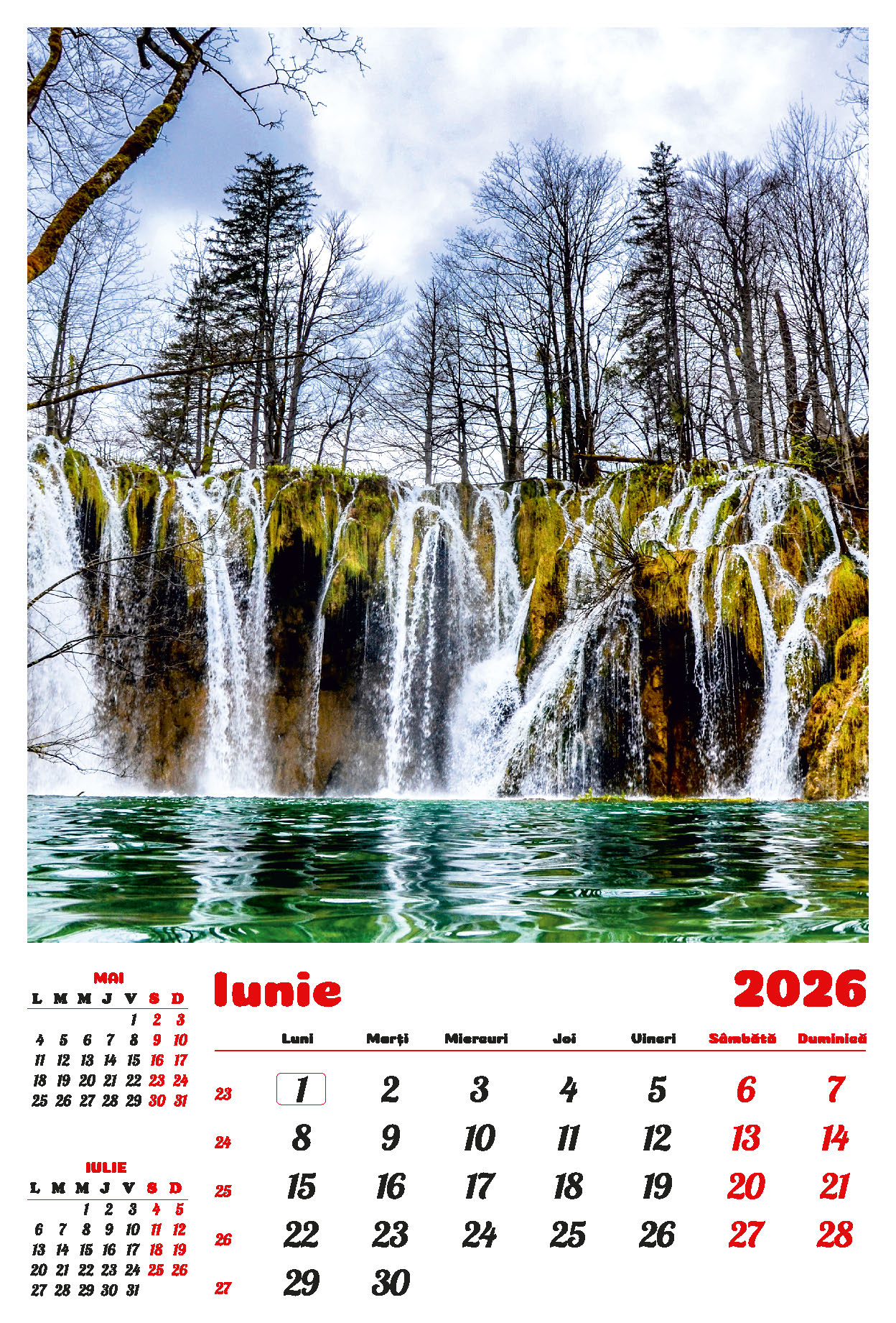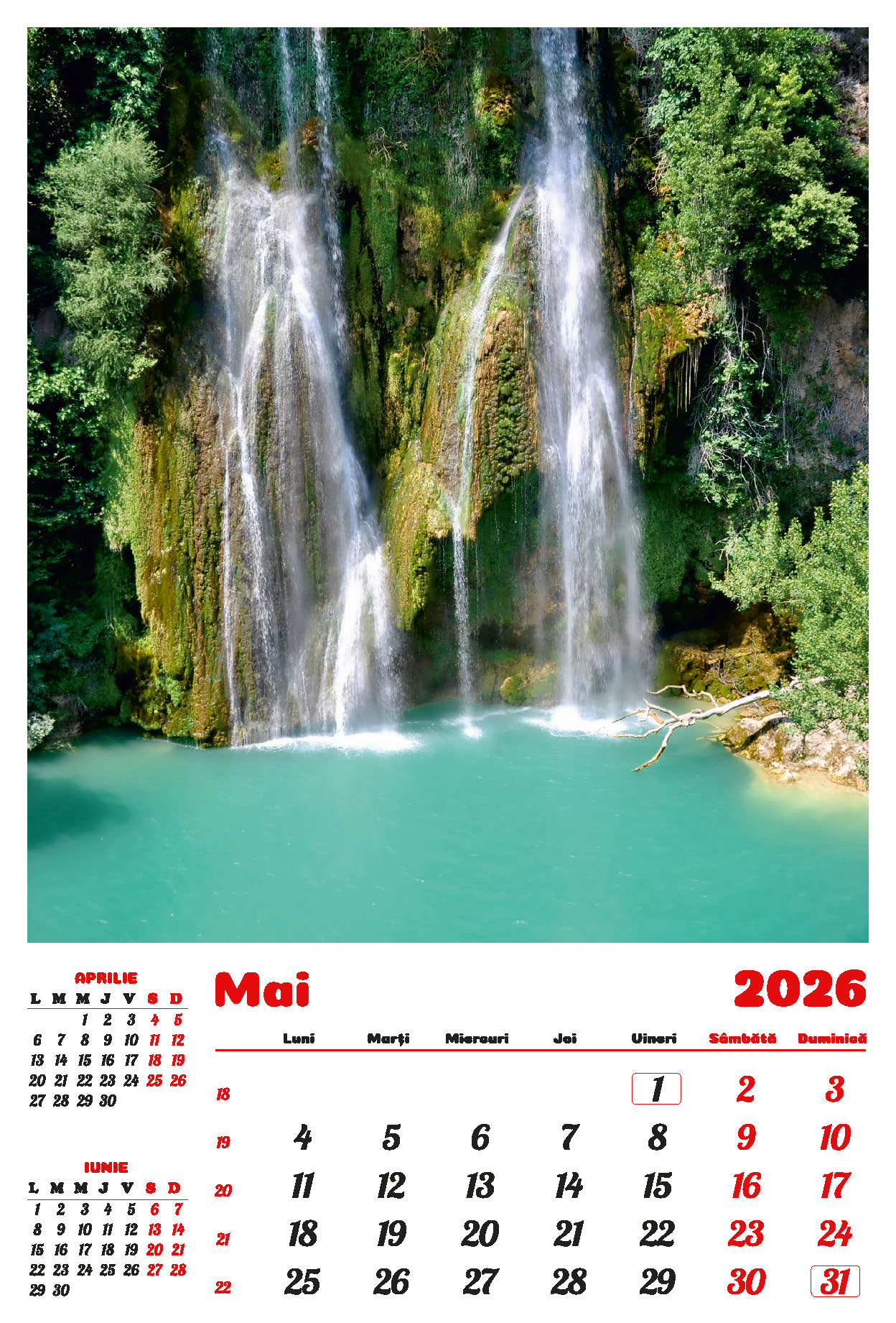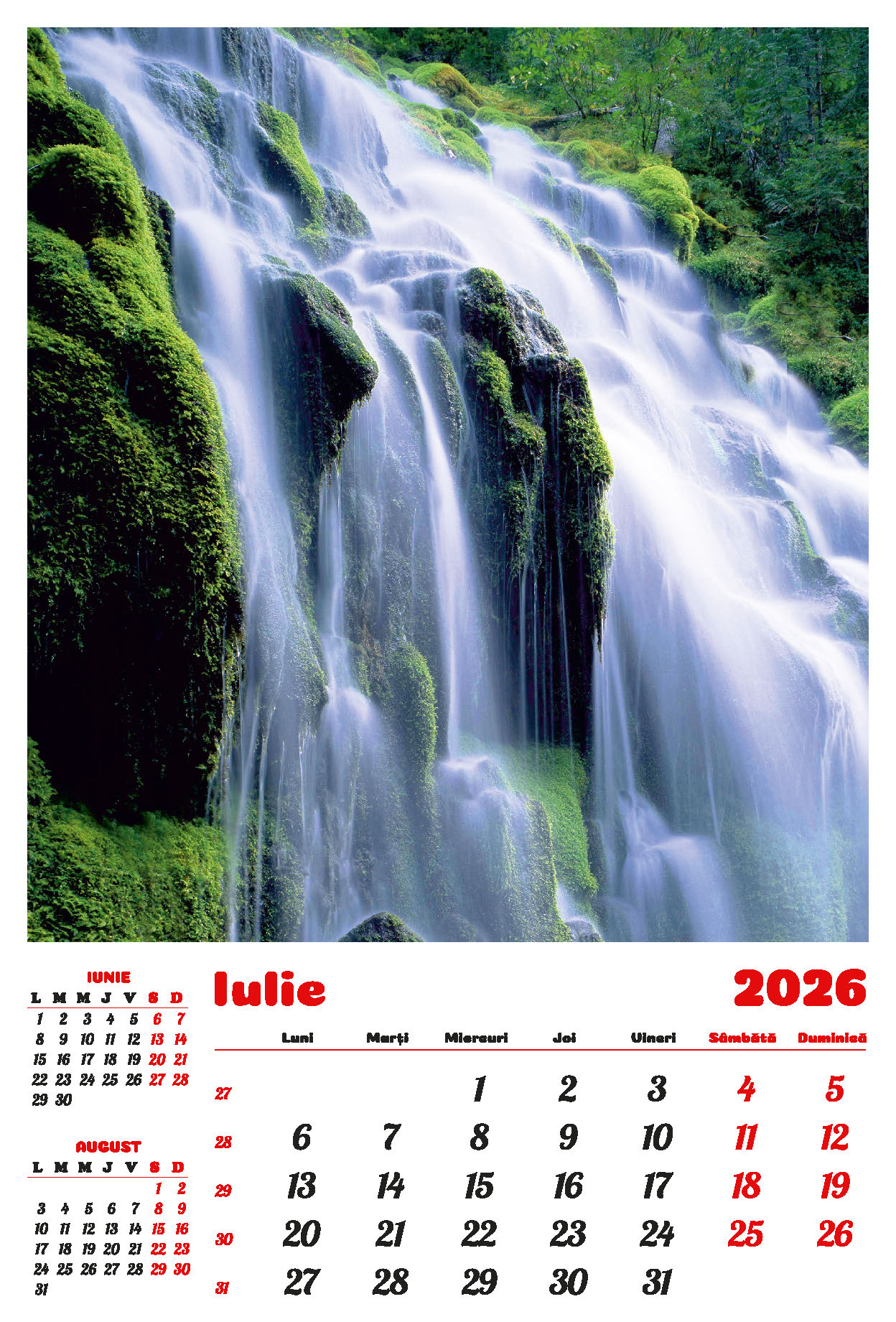 Calendarul de perete “Cascade” din colecția Darcom, pentru anul 2026, cu spiră metalică, conține 12 file plus copertă cu imagini ilustrând diferite cascade.