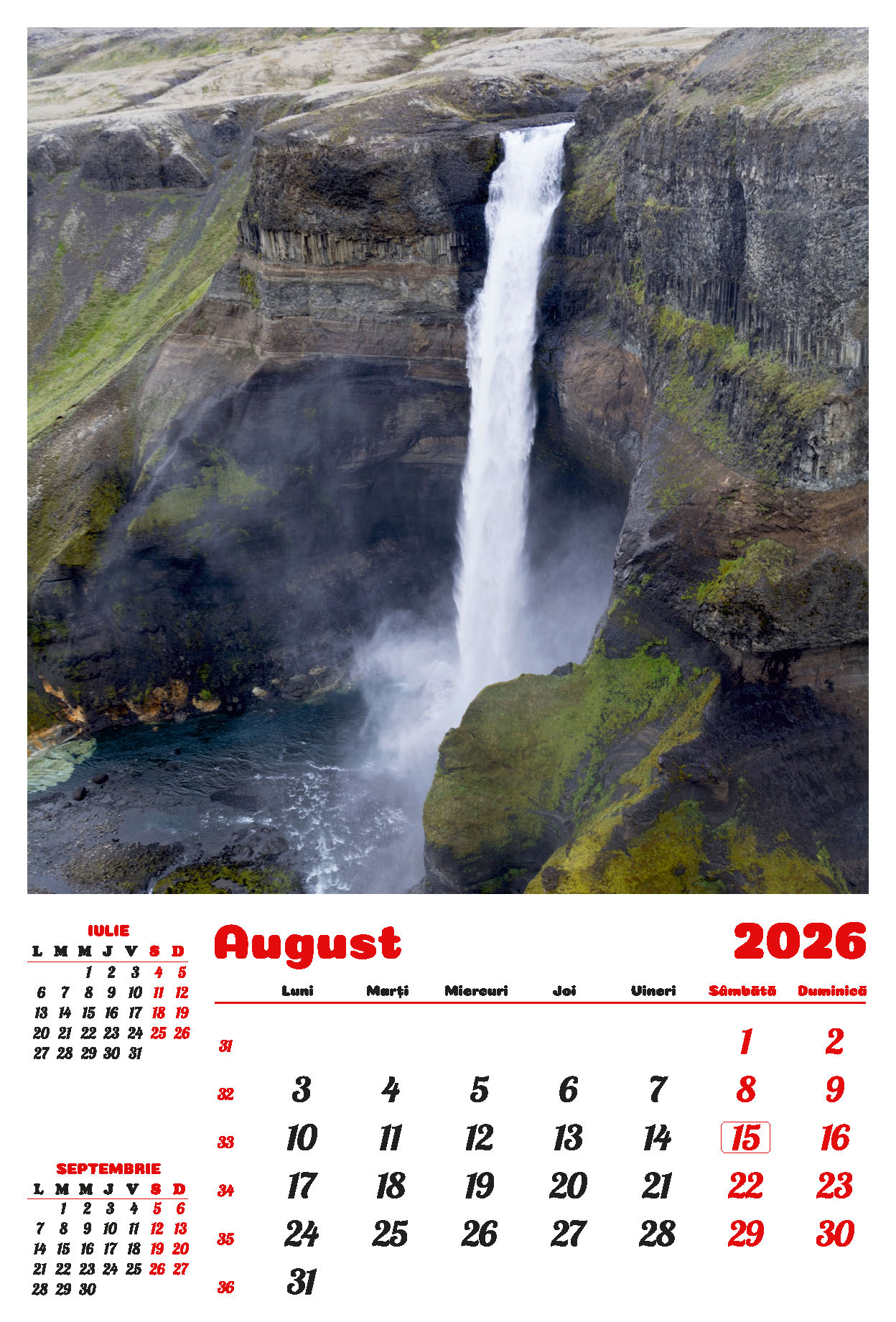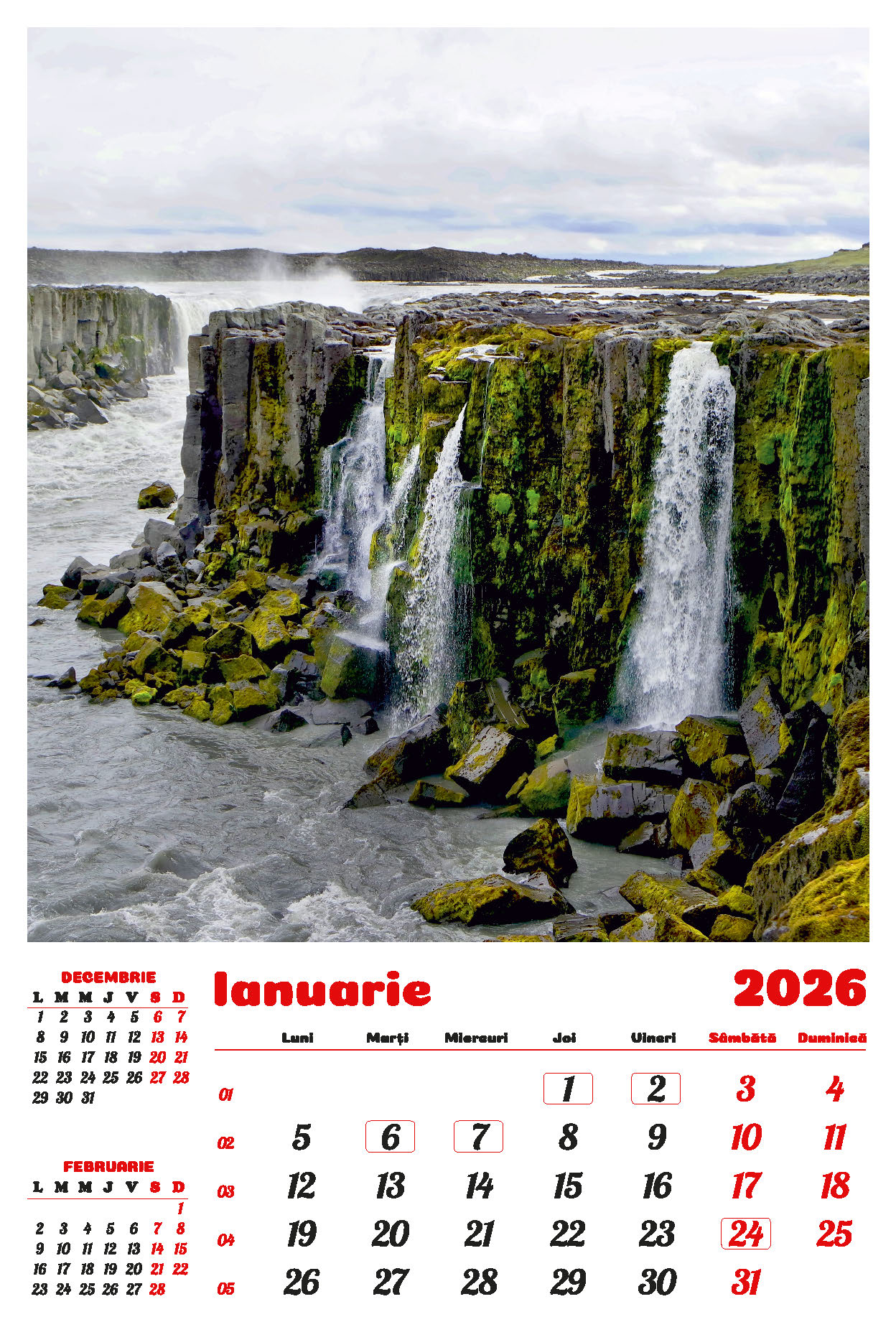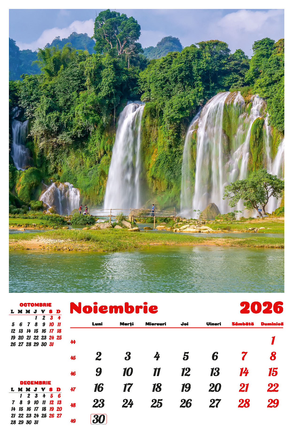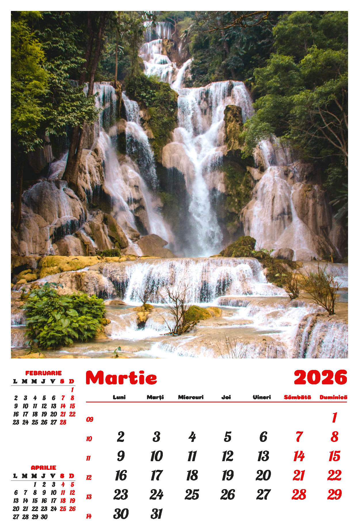 Calendarul de perete “Cascade” din colecția Darcom, pentru anul 2026, cu spiră metalică, conține 12 file plus copertă cu imagini ilustrând diferite cascade.