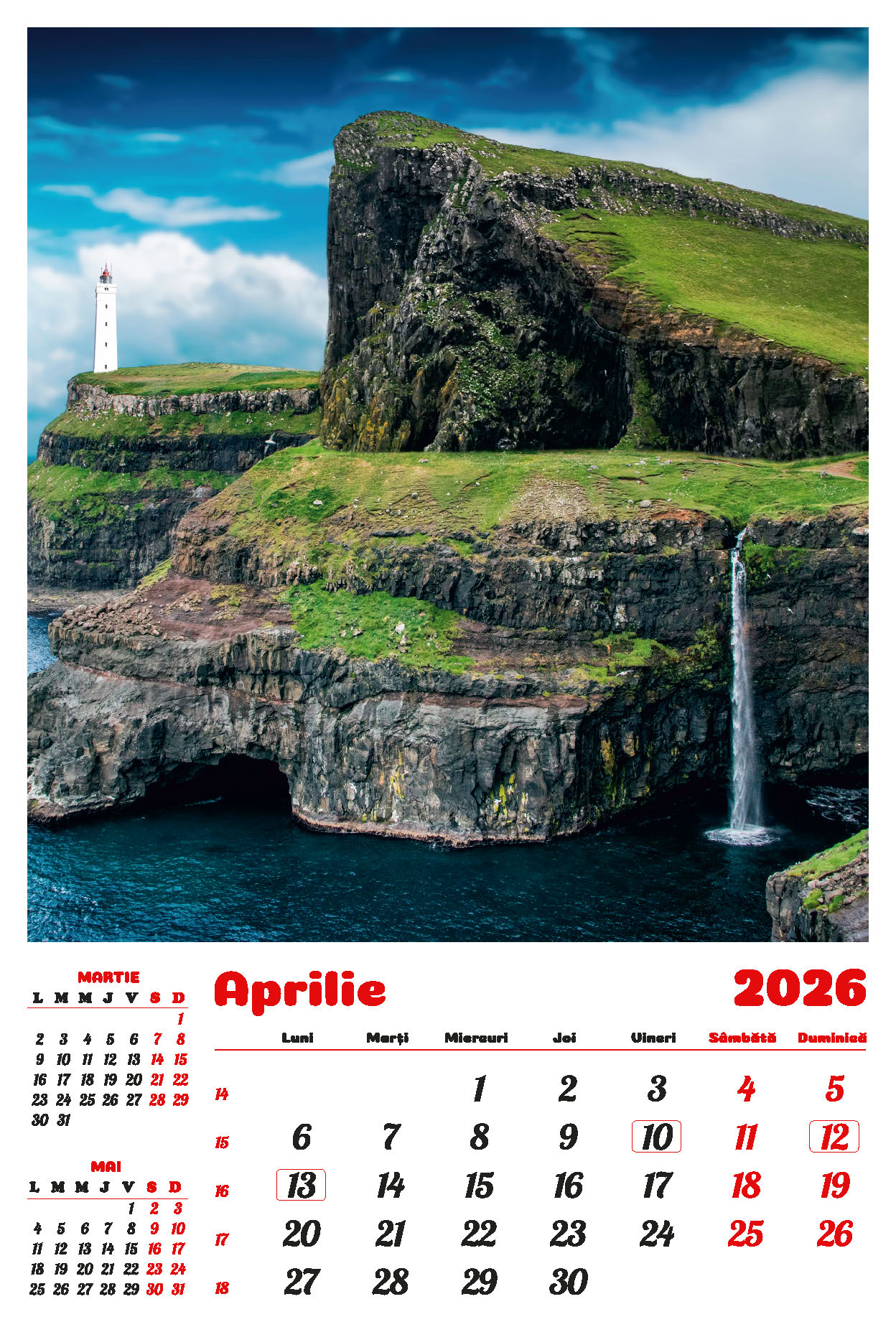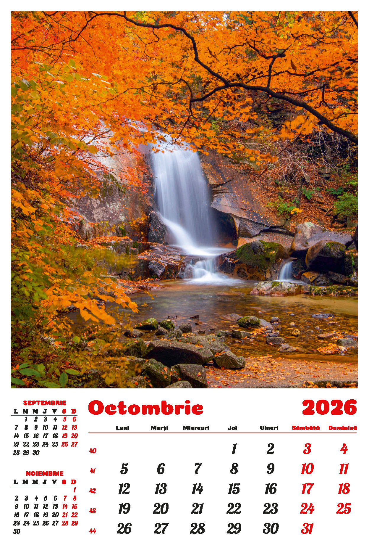 Calendarul de perete “Cascade” din colecția Darcom, pentru anul 2026, este confecționat din carton dublu cretat mat 150 g/mp, format 33 x 49 cm. Imprimarea este realizată în policromie.