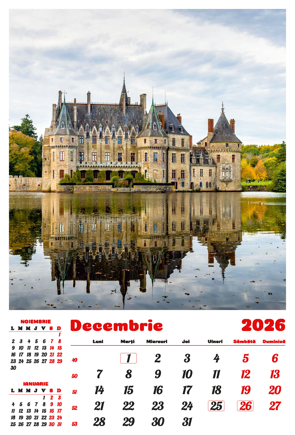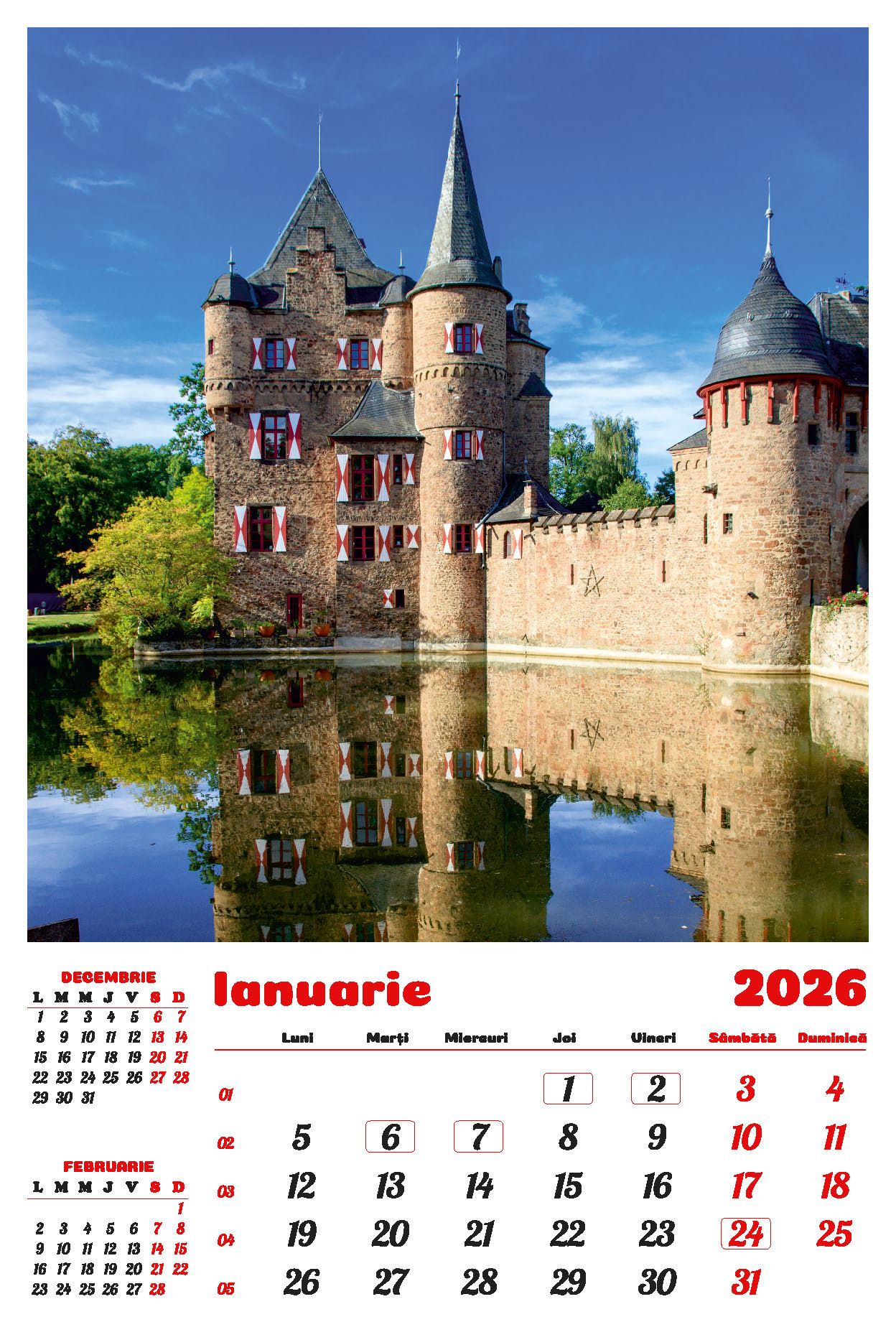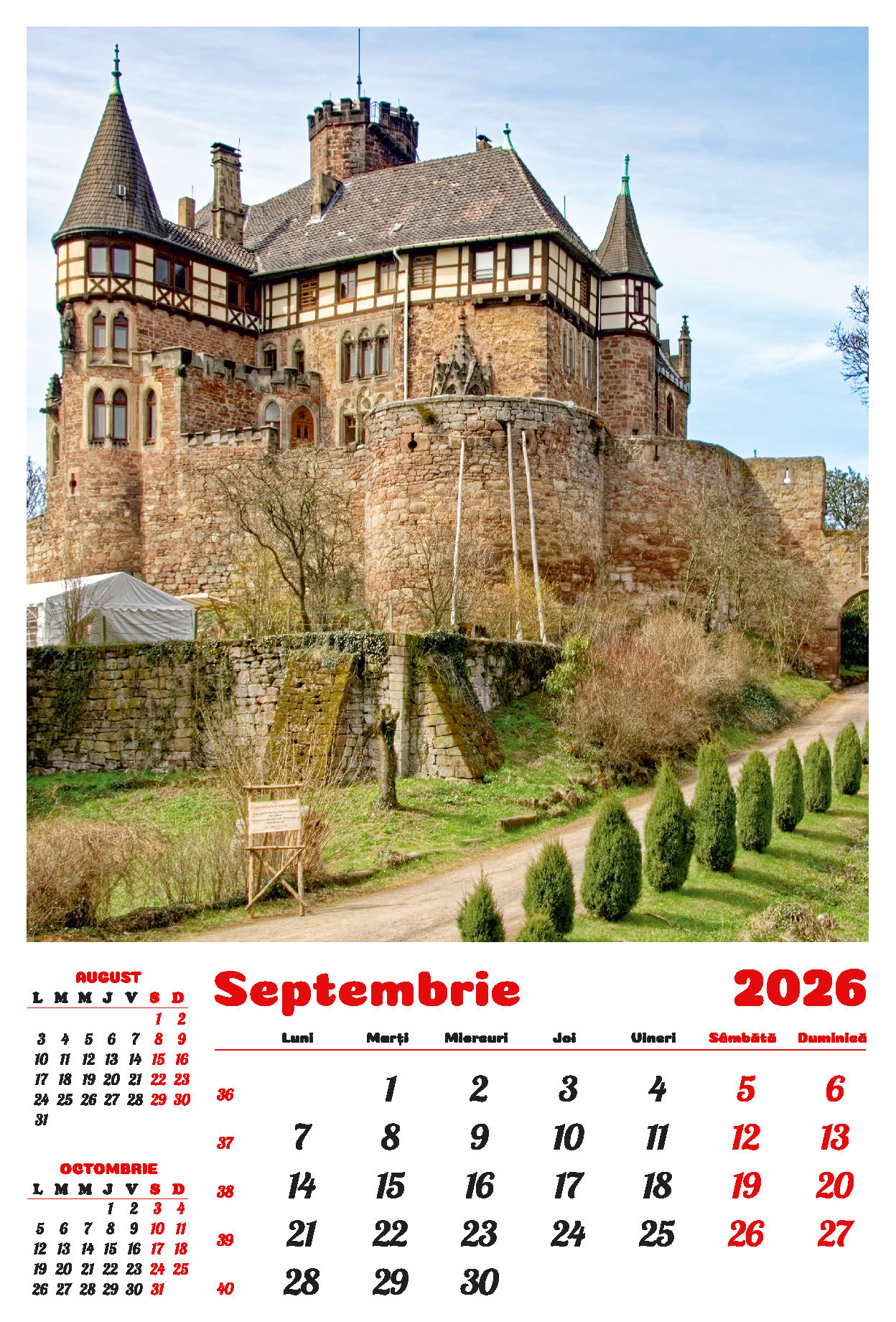 Calendarul de perete “Castele” din colecția Darcom, pentru anul 2026, cu spiră metalică, conține 12 file plus copertă cu diferite imagini ilustrând castele.