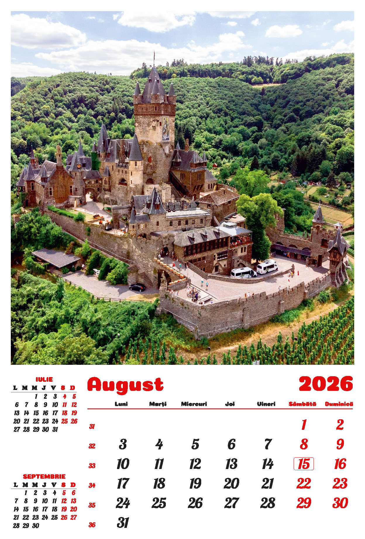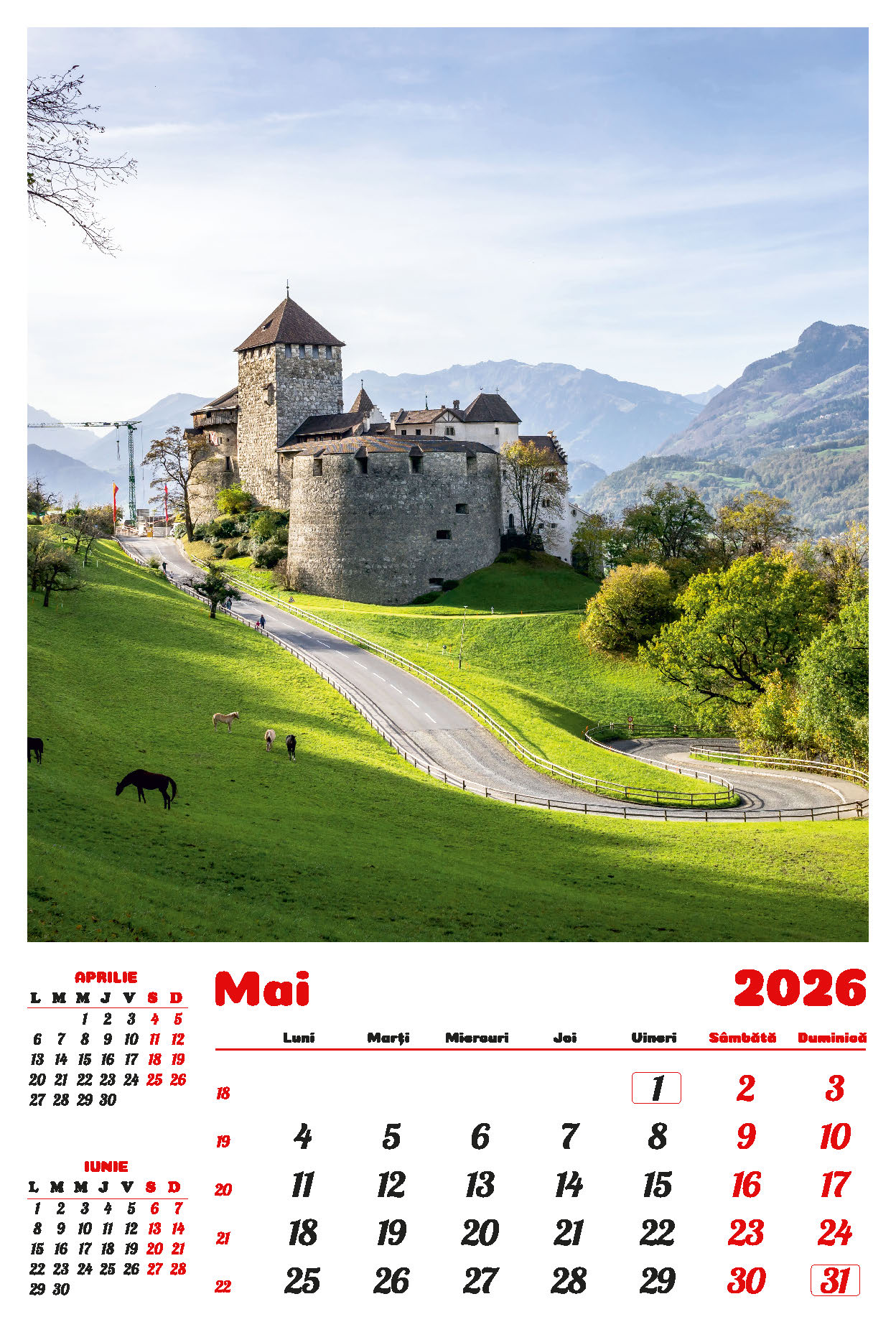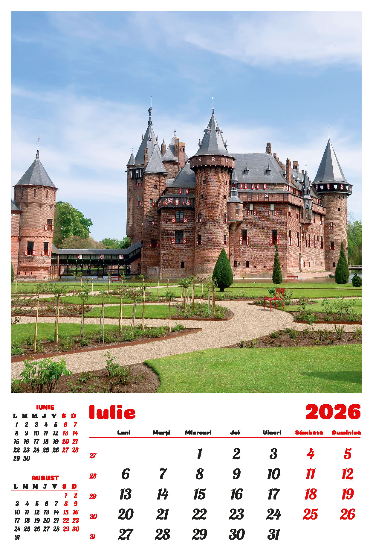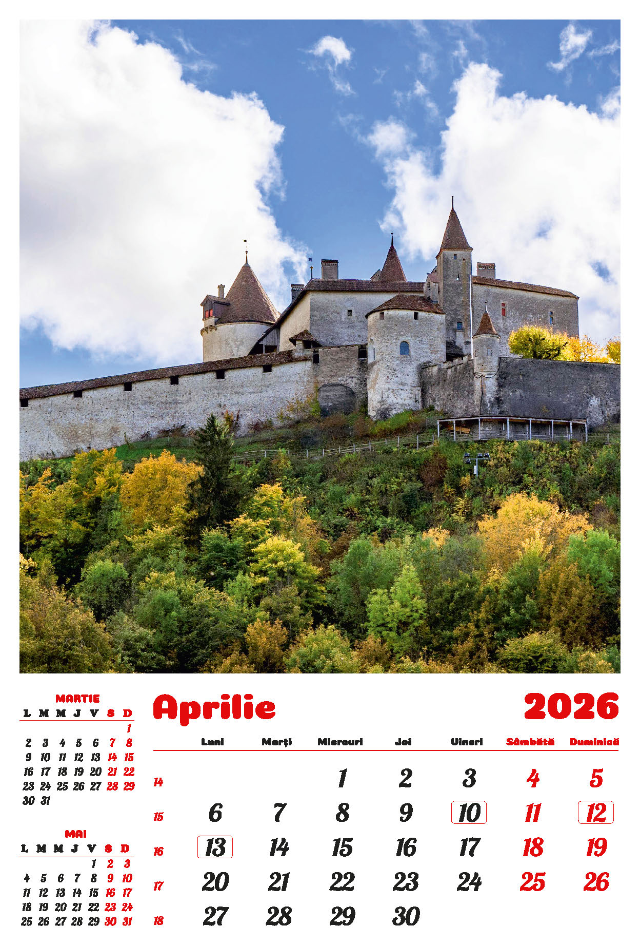 Calendarul de perete “Castele” din colecția Darcom, pentru anul 2026, cu spiră metalică, conține 12 file plus copertă cu diferite imagini ilustrând castele.