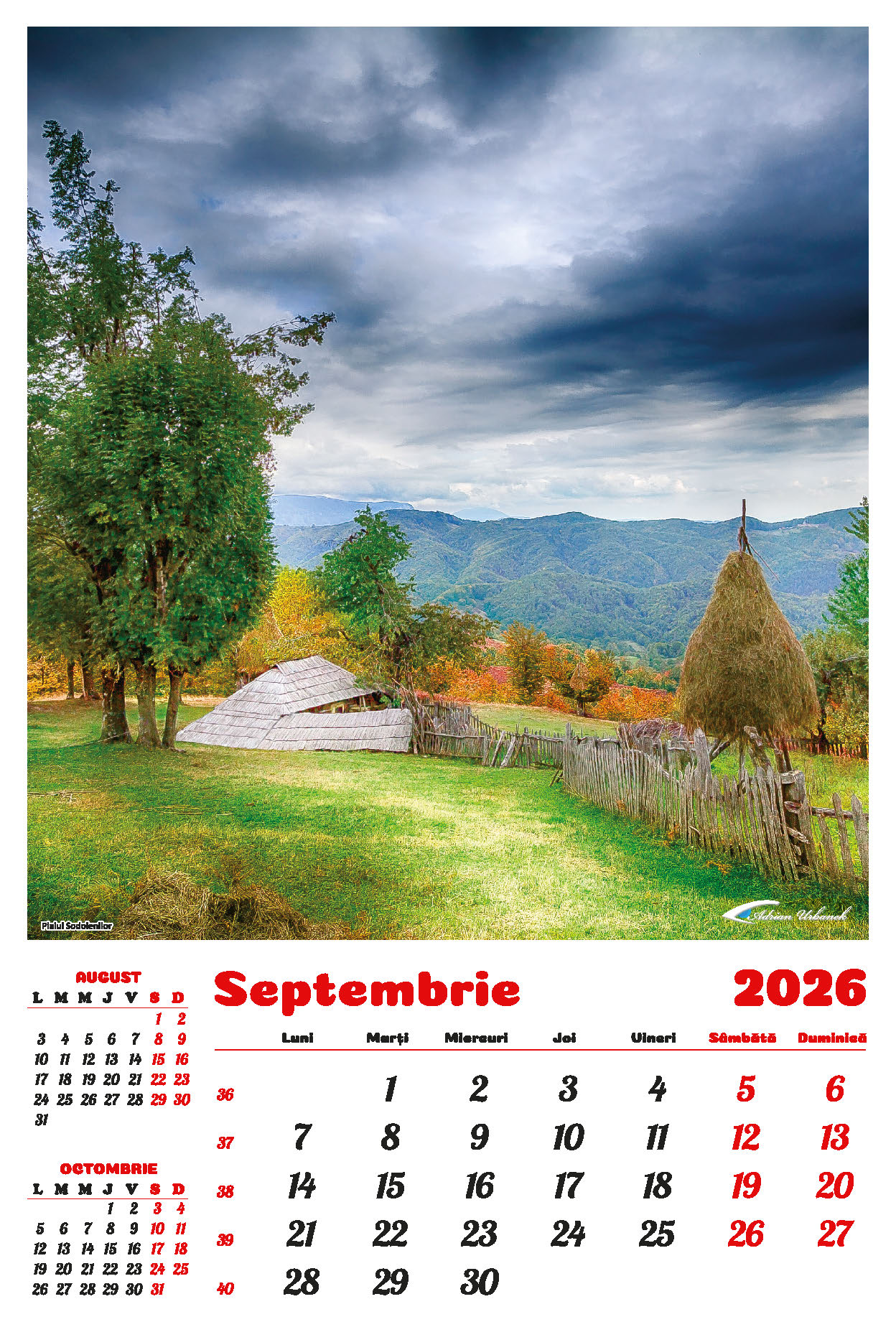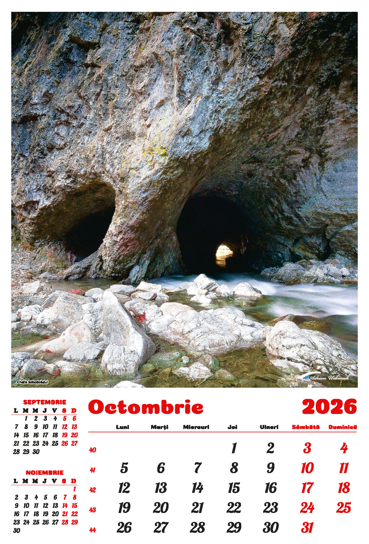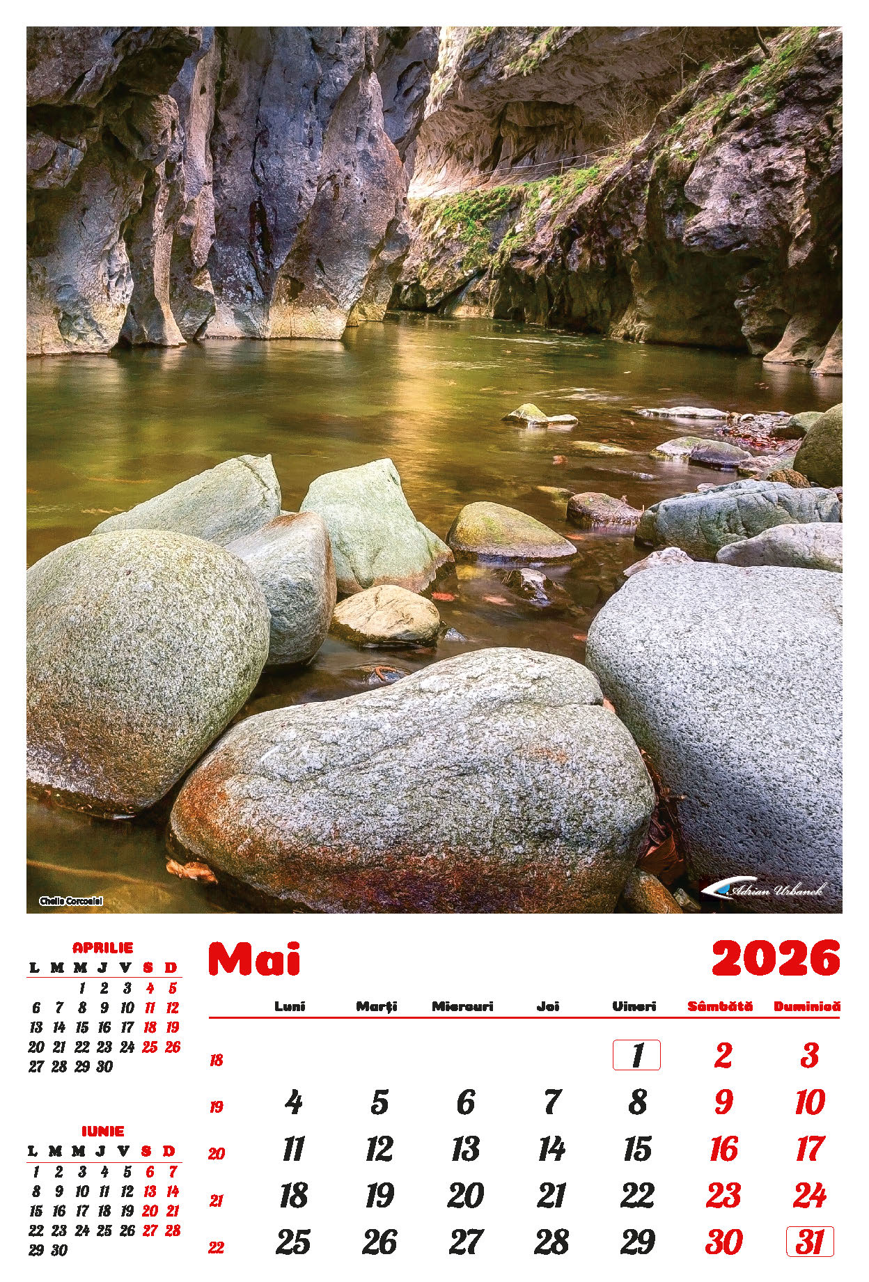 Calendarul de perete “Gorjul inedit” din colecția Darcom, pentru anul 2026, cu spiră metalică, conține 12 file plus copertă cu diferite imagini din Județul Gorj.