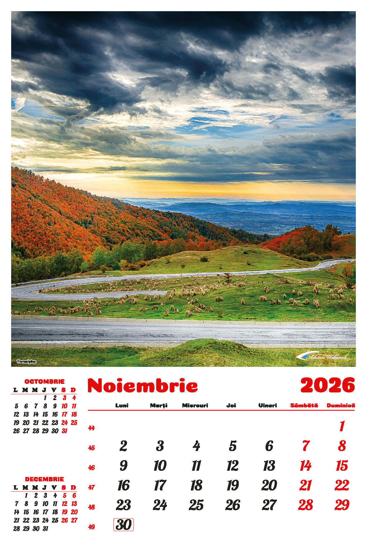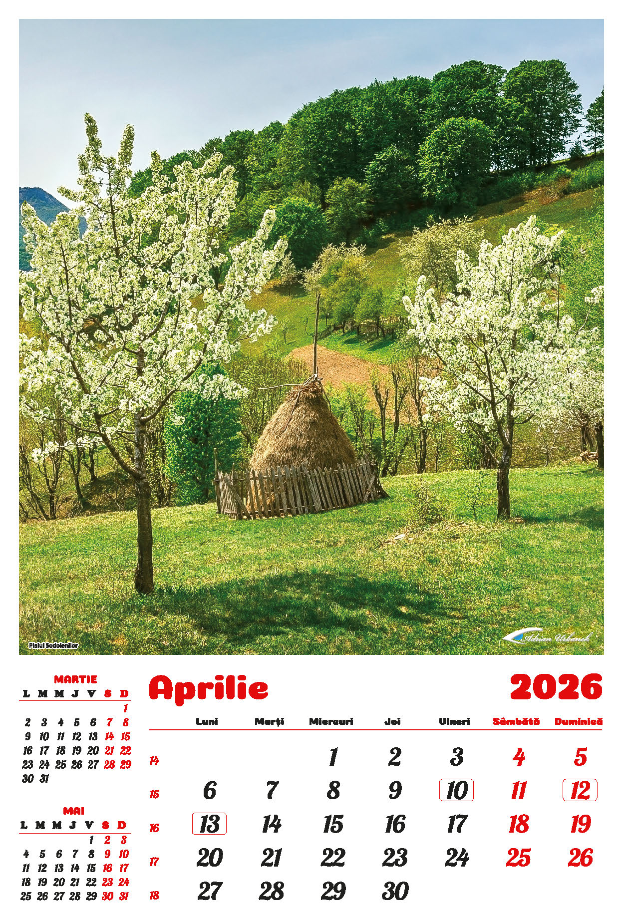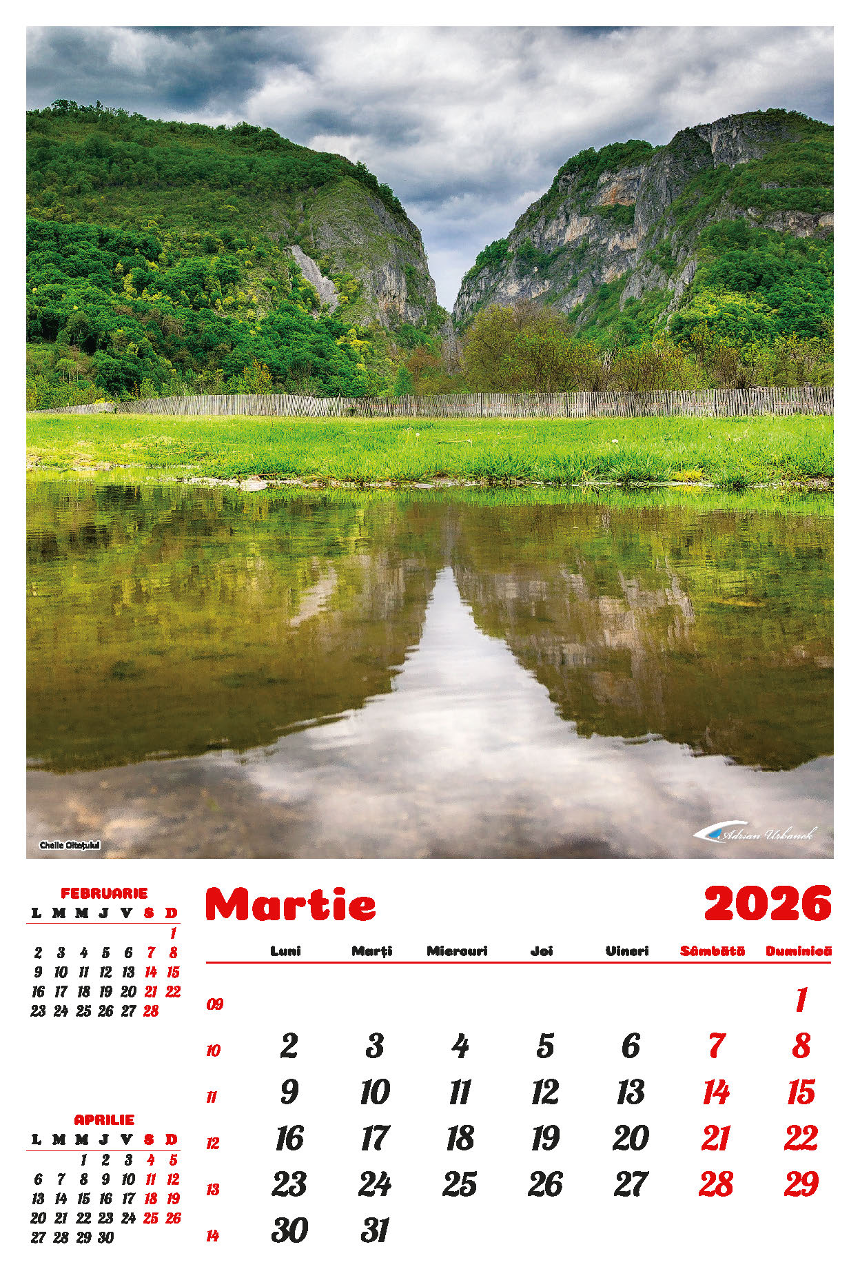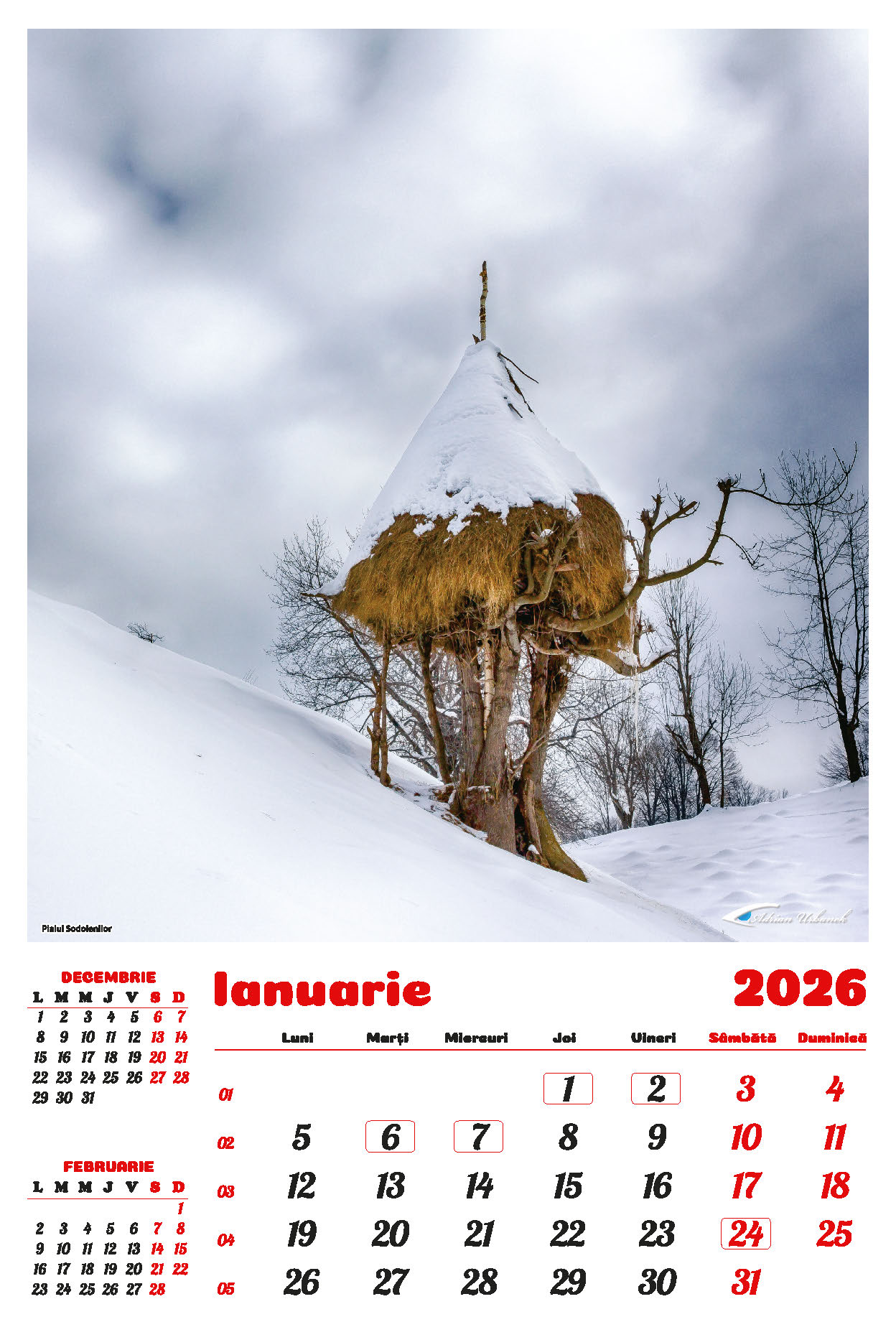 Calendarul de perete “Gorjul inedit” din colecția Darcom, pentru anul 2026, cu spiră metalică, conține 12 file plus copertă cu diferite imagini din Județul Gorj.