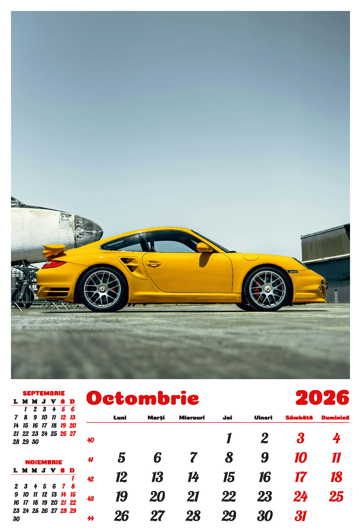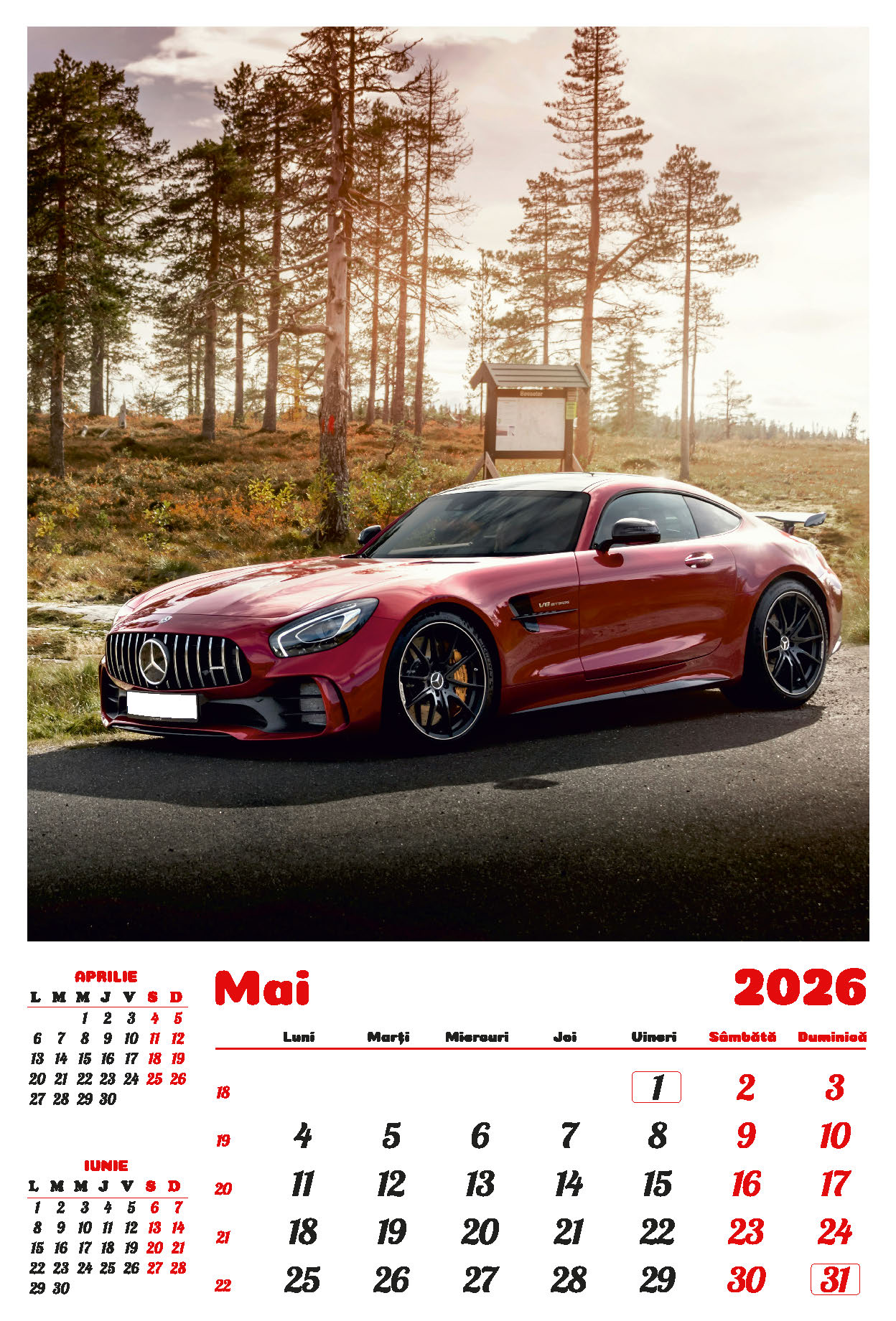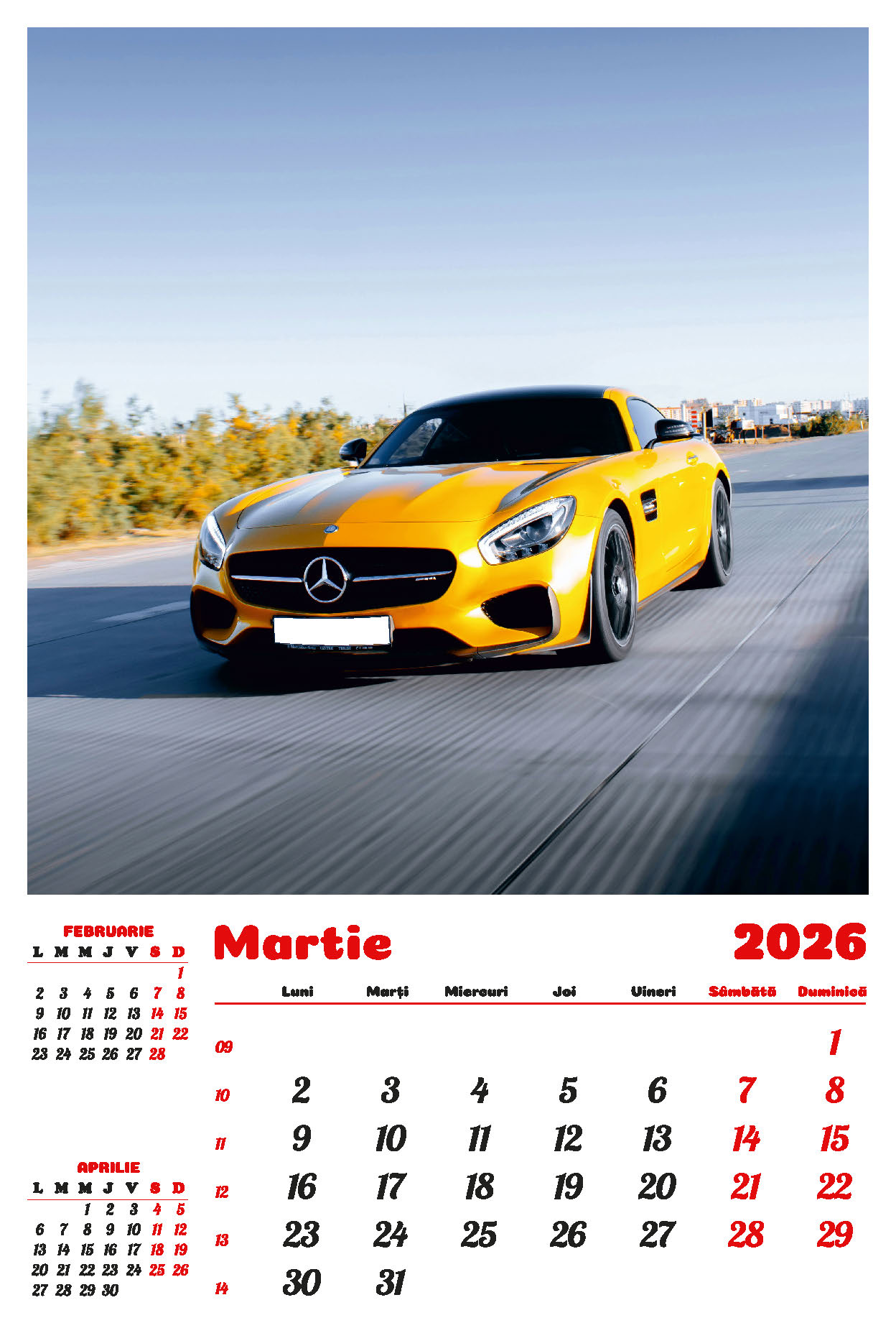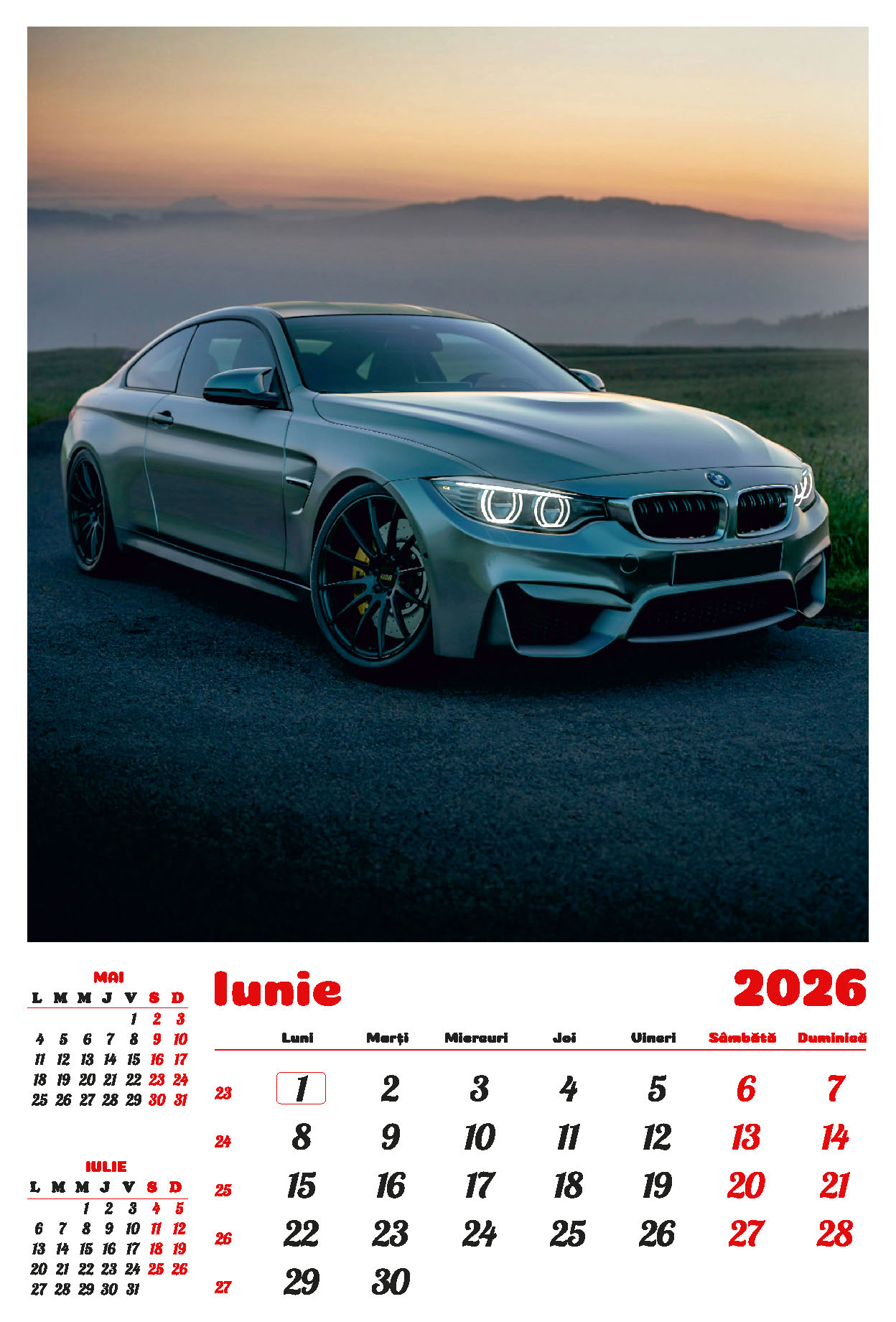 Calendarul de perete “Mașini” din colecția Darcom, pentru anul 2026, este confecționat din carton dublu cretat mat 150 g/mp, format 33 x 49 cm. Imprimarea este realizată în policromie.