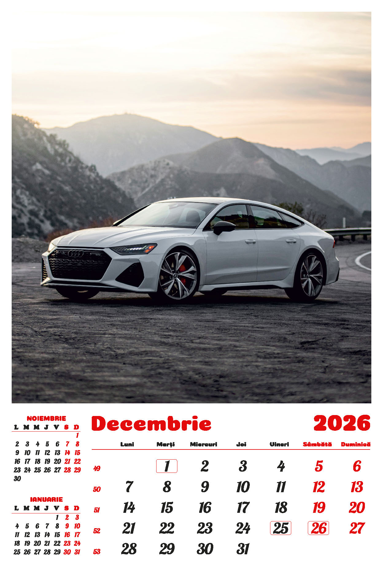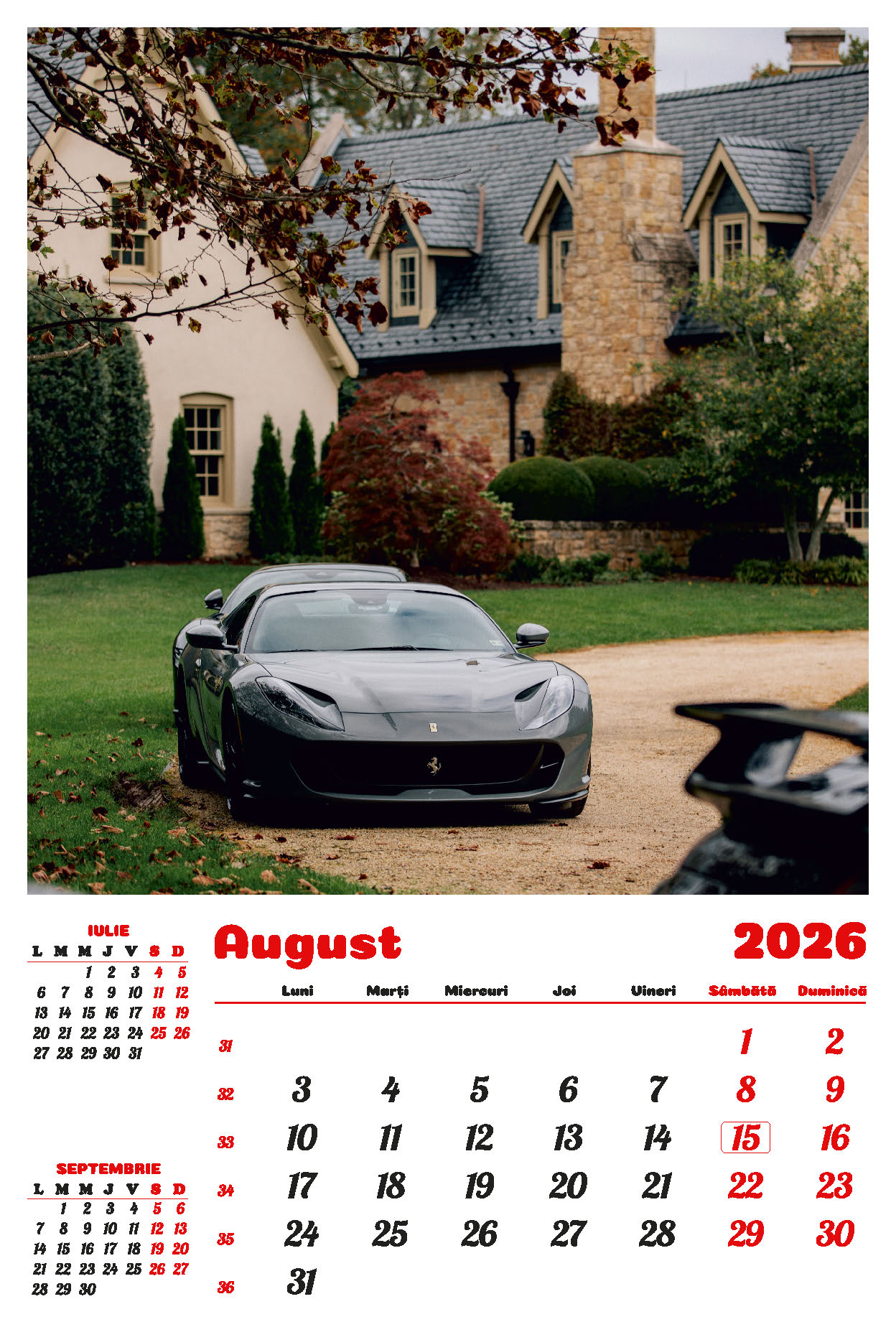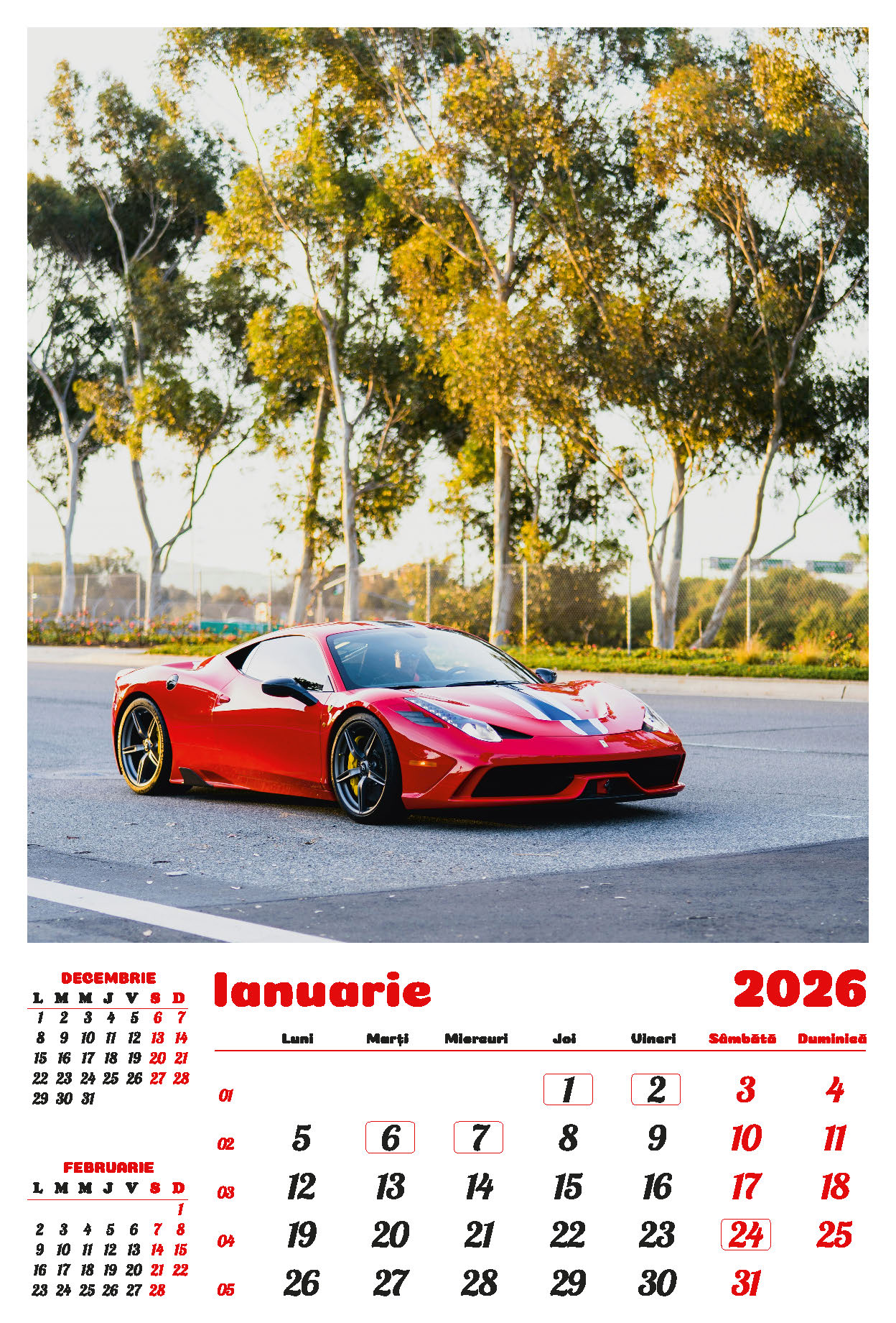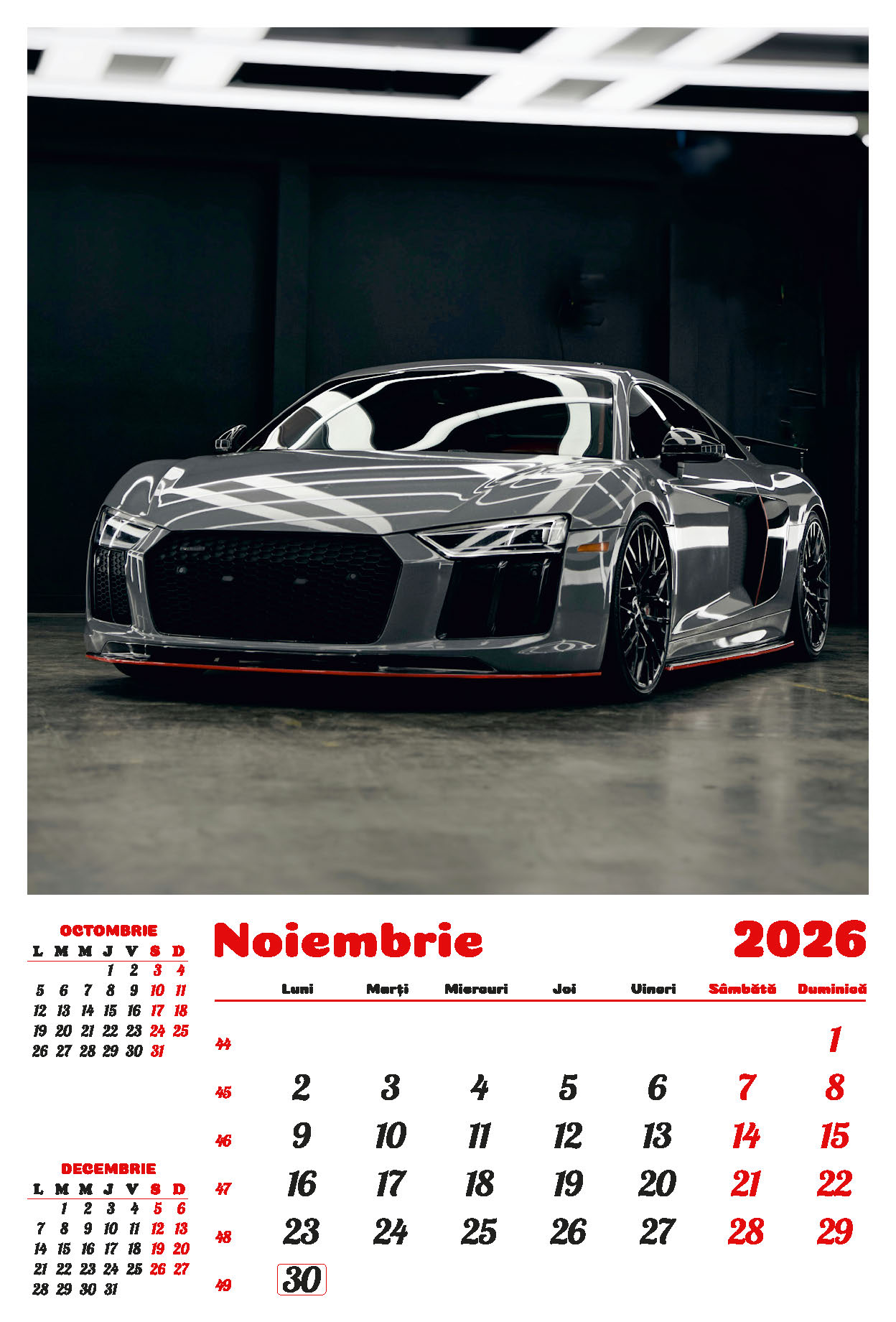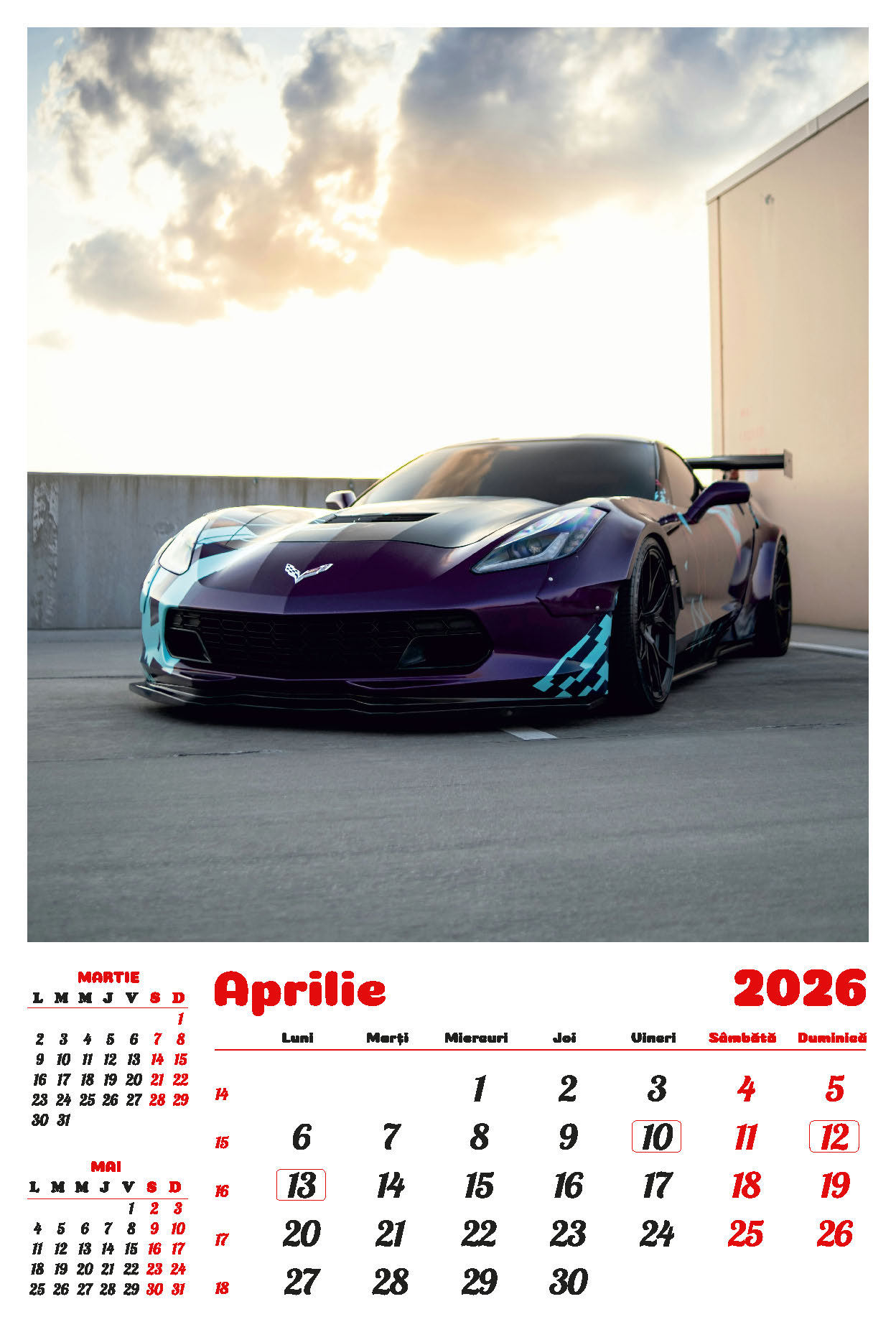 Calendarul de perete “Mașini” din colecția Darcom, pentru anul 2026, este confecționat din carton dublu cretat mat 150 g/mp, format 33 x 49 cm. Imprimarea este realizată în policromie.